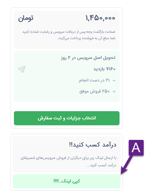 1_ در سرویس ها: لینک همکاری در فروش در سایدبار سمت چپ صفحهA قرار دارد. لینک همکاری در فروش، هر معرف منحصربه فرد بوده و از 4 قسمت (آدرس سایت/p/آی دی سرویس/آی دی ریفرال) تشکیل شده است.