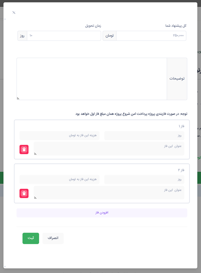فریلنسر میتواند در زمان ارسال پیشنهاد، مراحل پروژه، زمانبندی و هزینه هر فاز را تعریف و ثبت کند.
