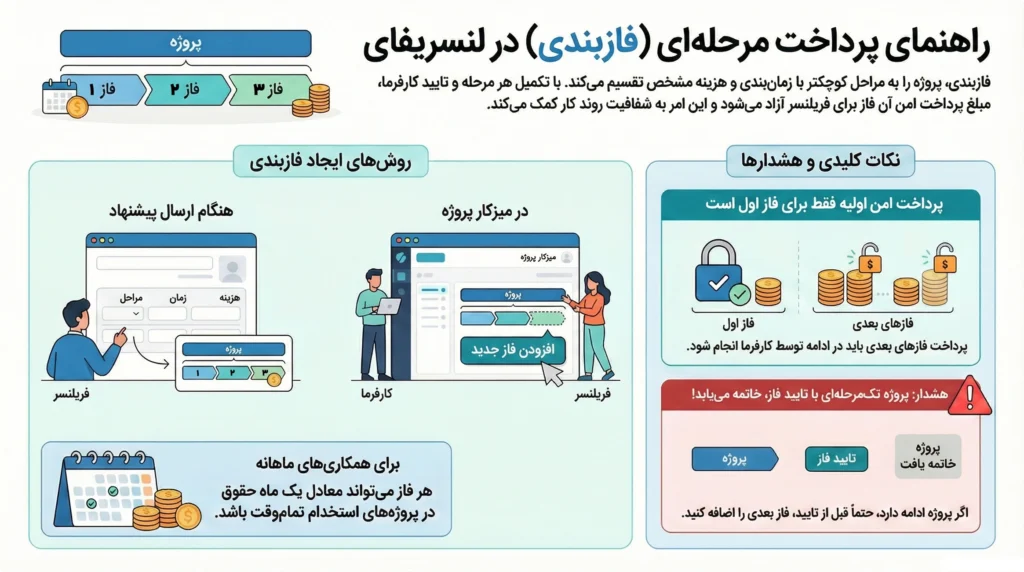 در پروژههای استخدام تماموقت یا همکاری ماهانه، میتوان از قابلیت فازبندی برای مدیریت پرداخت حقوق استفاده کرد. در این حالت، هر فاز معادل یک ماه همکاری تعریف میشود و مبلغ حقوق متخصص در پایان هر ماه بهعنوان همان فاز تنظیم و پرداخت خواهد شد. این روش باعث شفافیت، نظم مالی و تسهیل مدیریت پرداختهای ماهانه میشود.